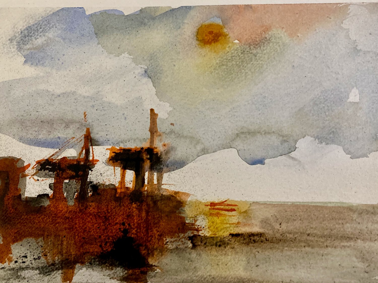 Sun over the Teesmouth estuary, Redcar bulk terminal cranes stand on the hinterland like giant impostors.